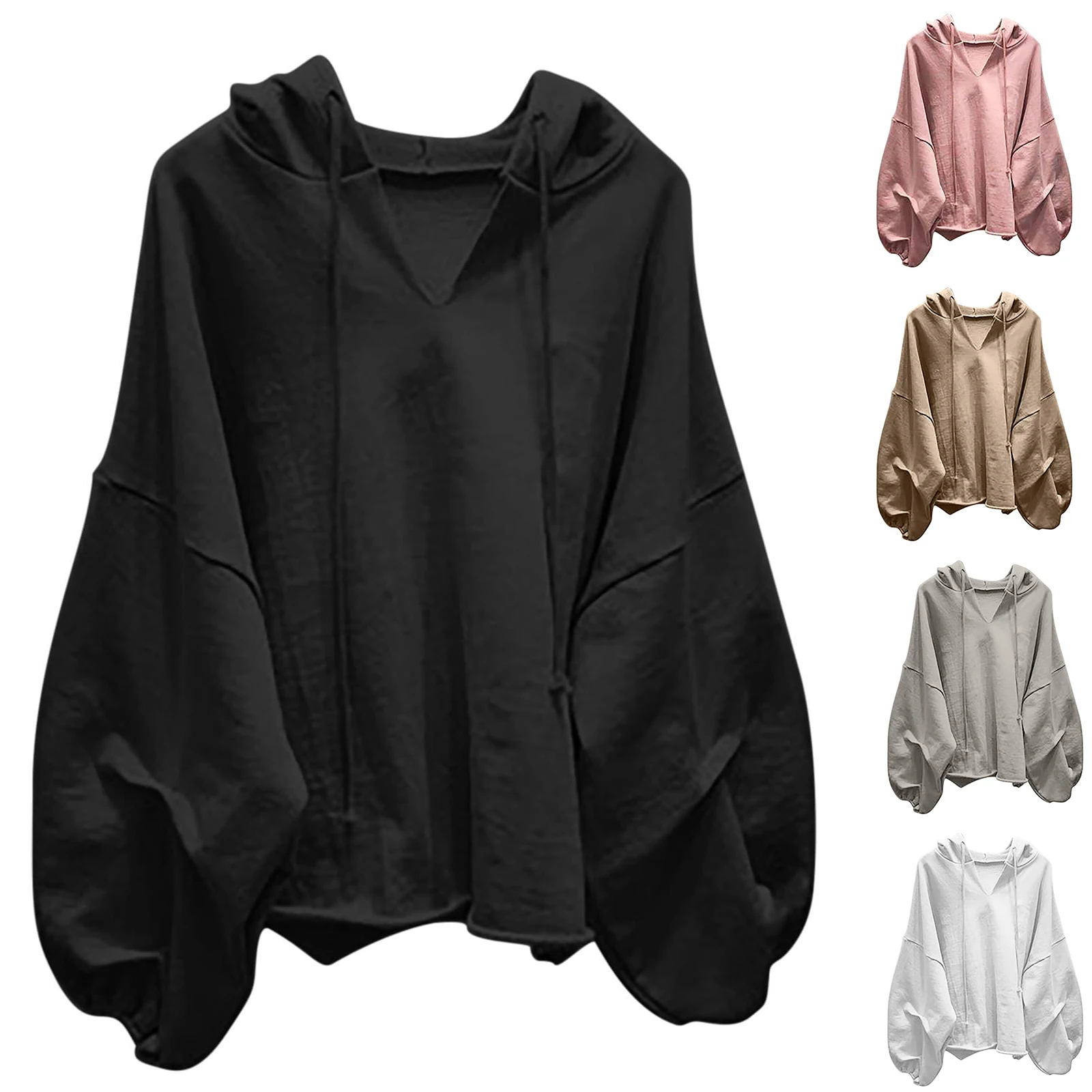 Women's Fashion Casual Solid Color V-Neck Hooded Loose Long Sleeve Sweatshirt